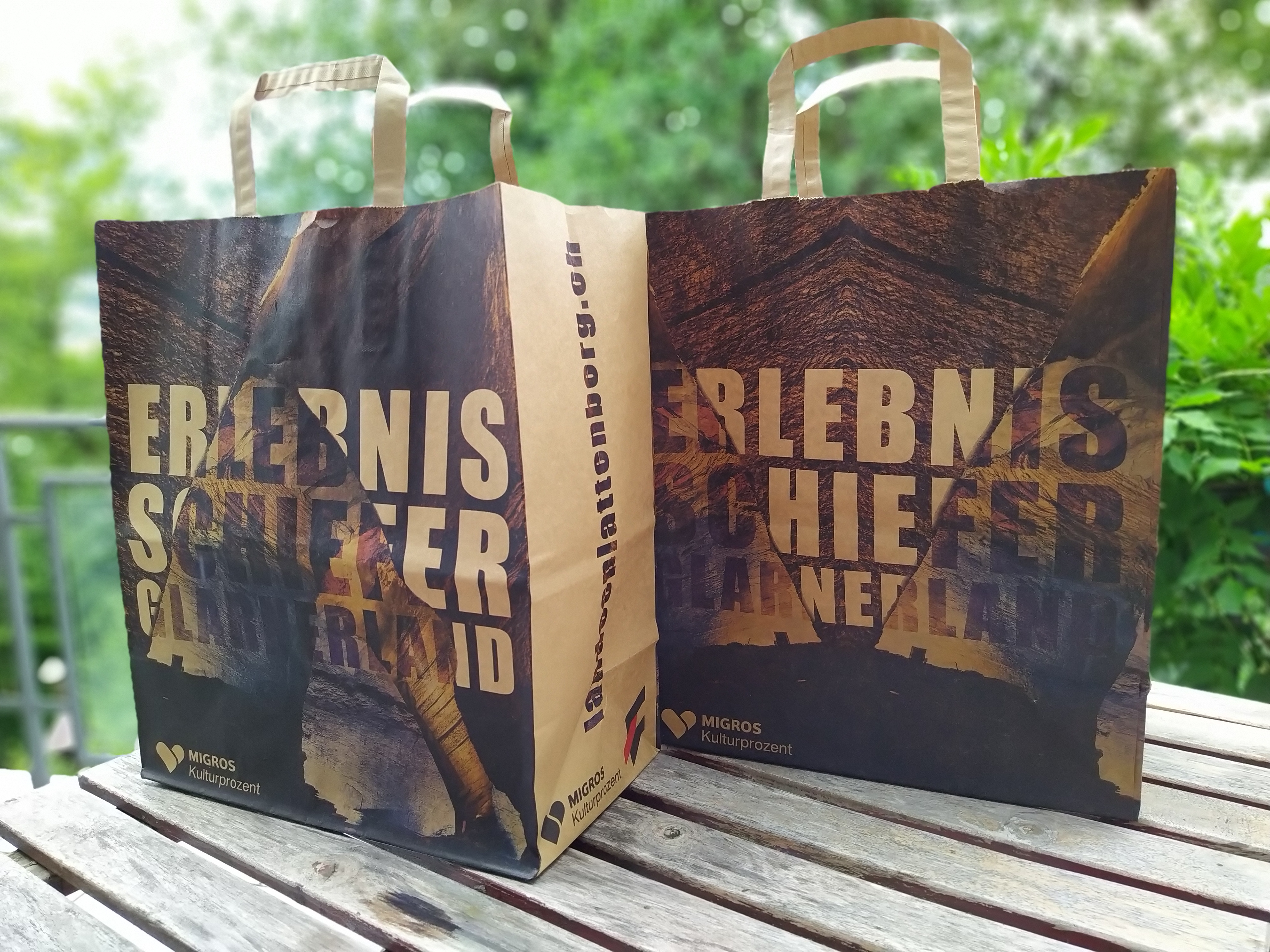 Tragetaschen aus Naturpapier für die Migros, im Auftrag der Ferienregion Elm, zum Thema Landesplattenberg Engi. Unten: Alternative Vorschläge (Skizzen)