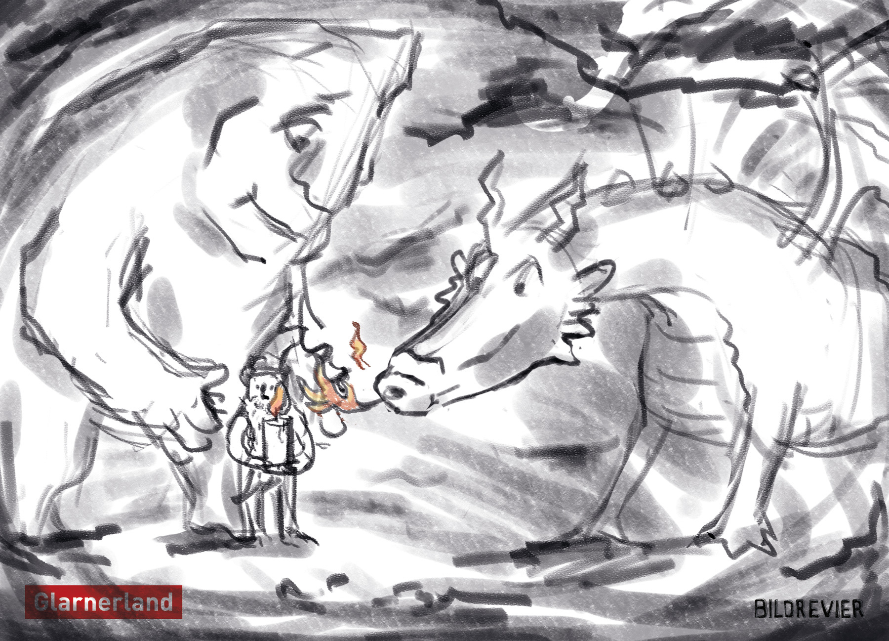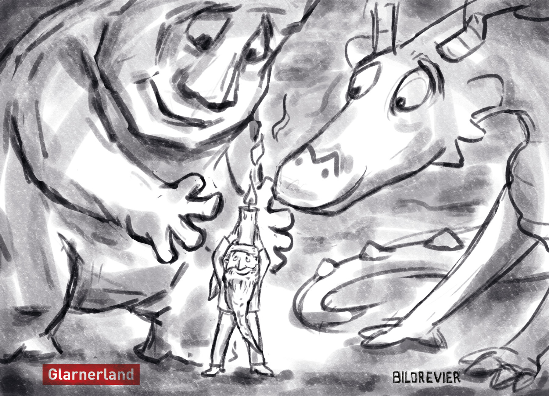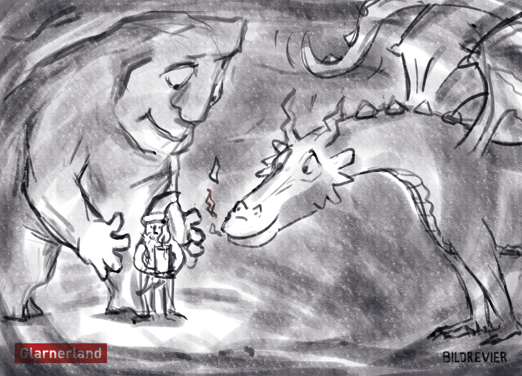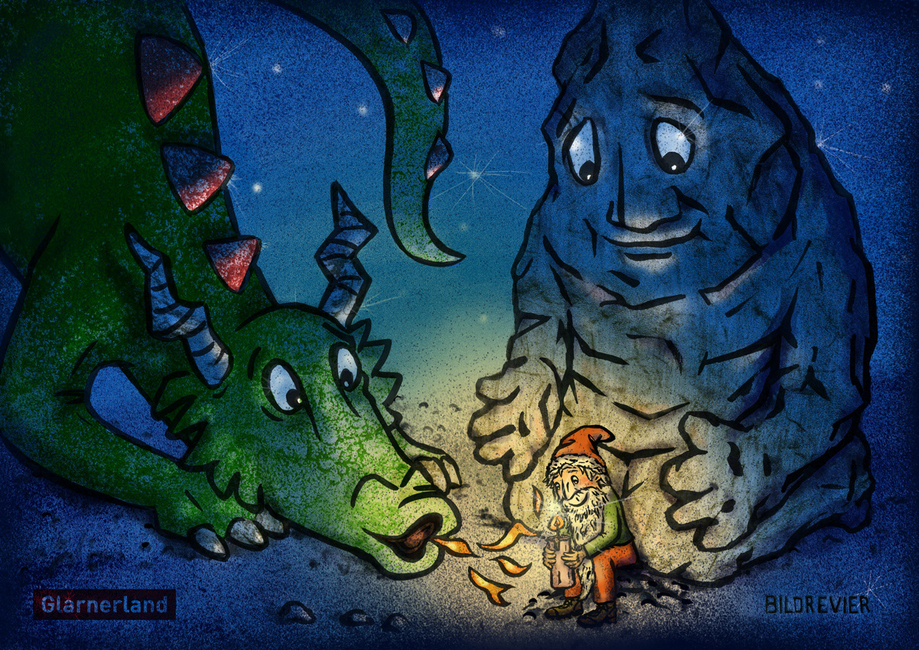 llustration für Postkarte von VISIT Glarnerland: Die drei Maskottchen von Glarus Nord (Drache), Elm (Riese Martin) und Braunwald (Zwerg Bartli) erhalten gemeinsam den Lebensfunken. Mixed Media. Unten: Skizzen